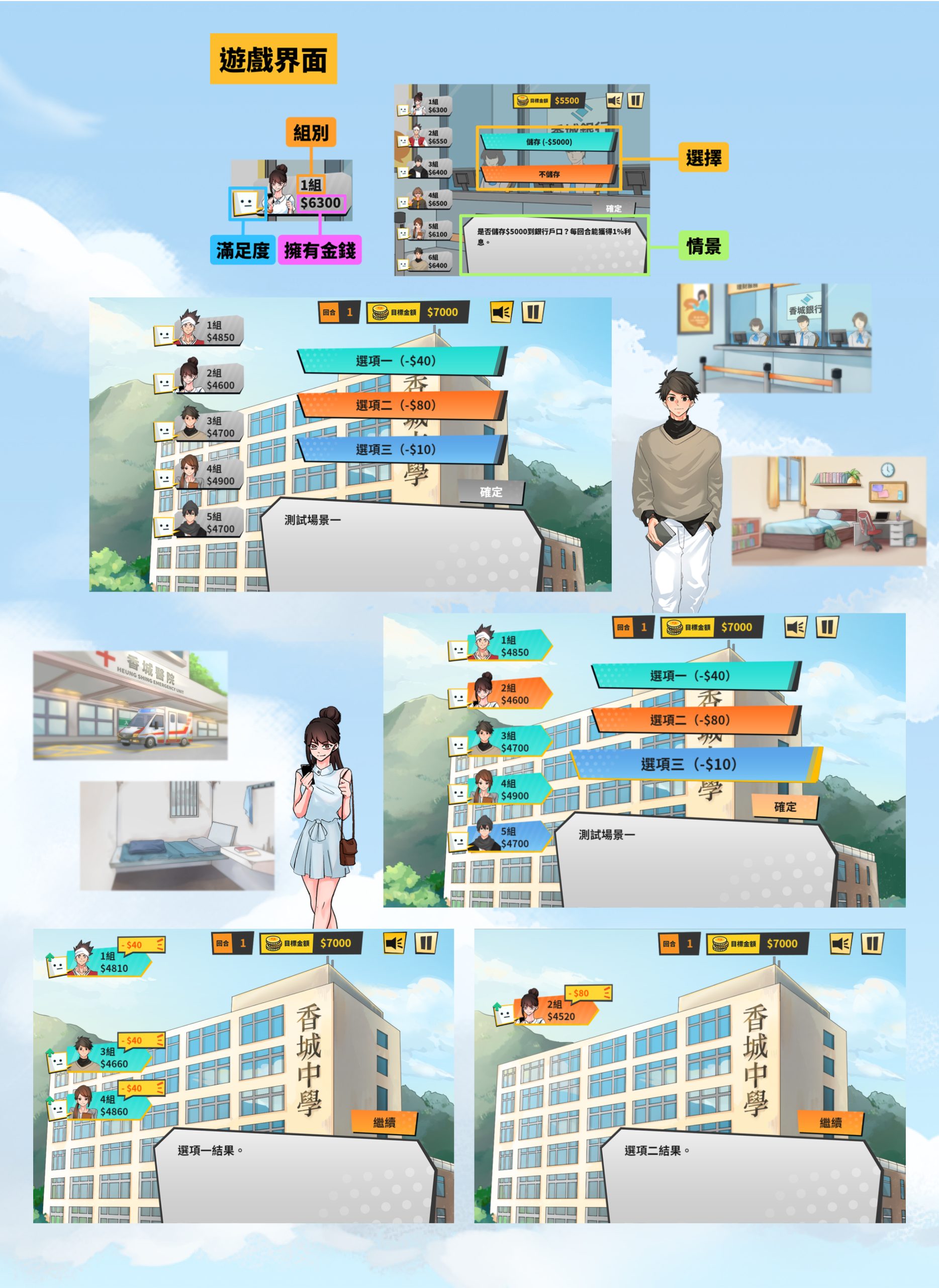 玩家可以喺三男三女選擇角色,每個角色都擁有專屬嘅故事線,配合人物設定有唔同嘅事件遭遇次序同起始金額。玩家喺遊戲中模擬角色人生,面對金錢誘惑作出判斷,增加對金錢管理嘅認識,提升理財能力。