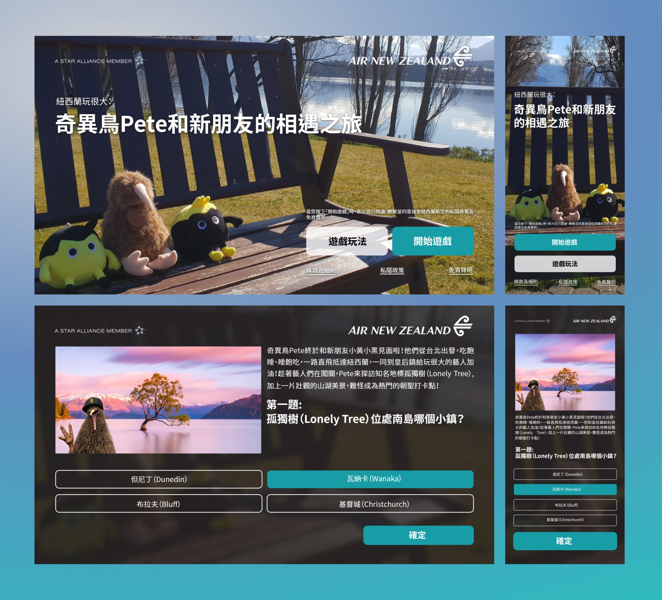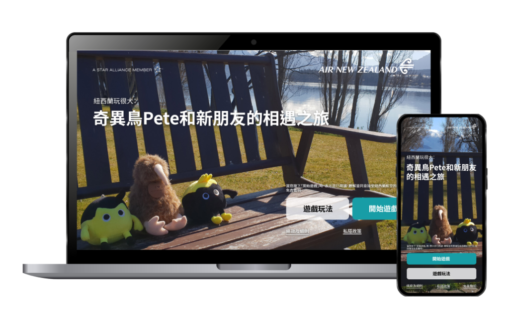奇異鳥Pete和新朋友的相遇之旅是一個為紐西蘭航空公司設計的宣傳遊戲。玩家需完成一系列關於紐西蘭小知識的問答遊戲,從而參加壓軸的抽獎活動。