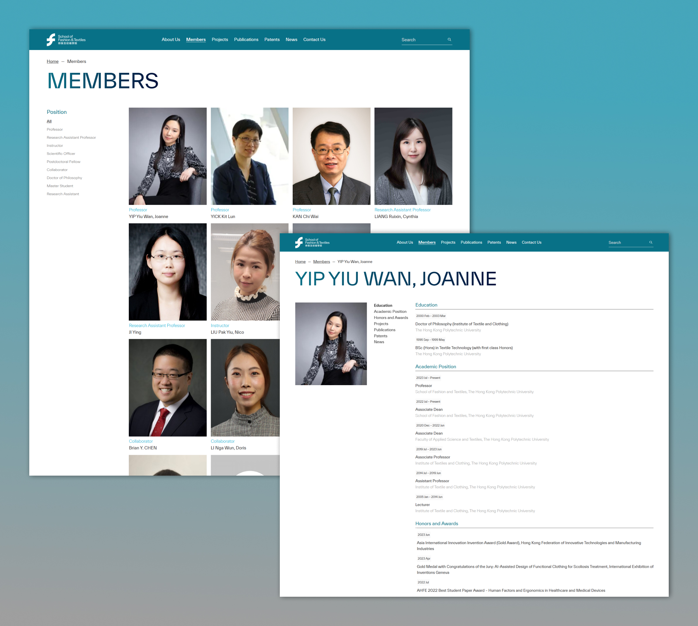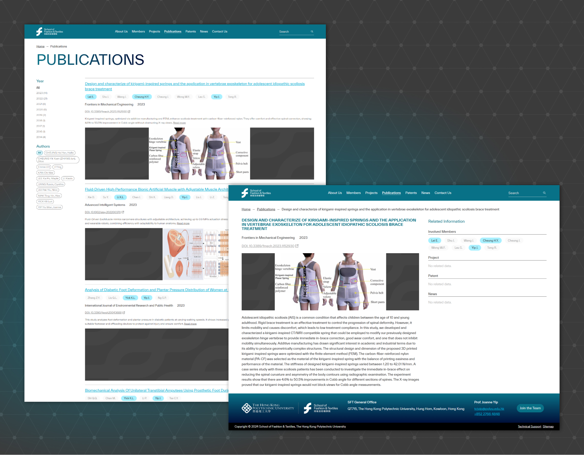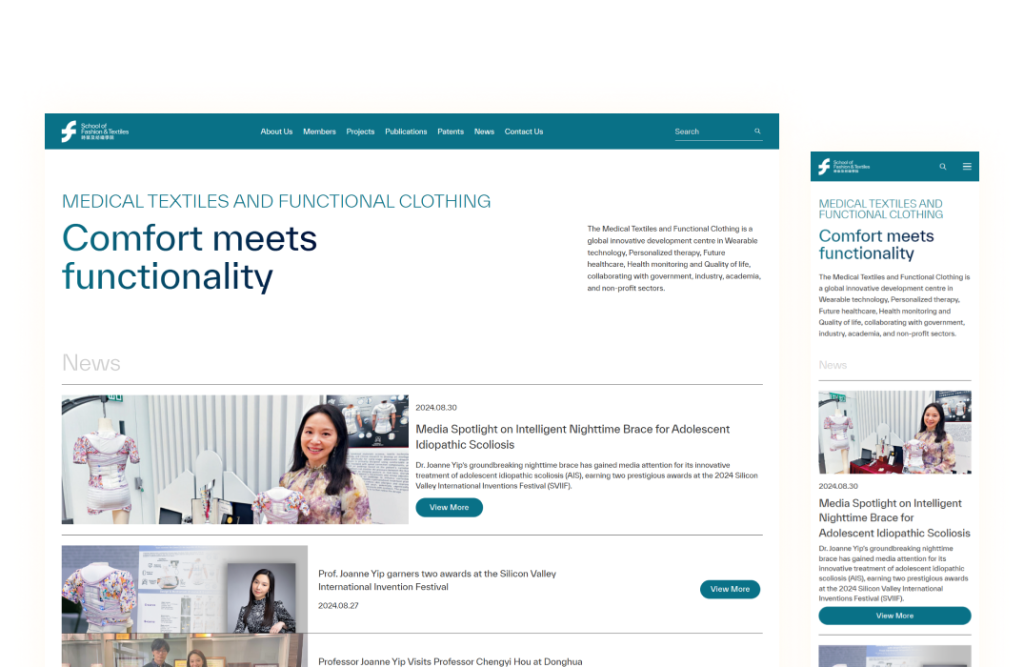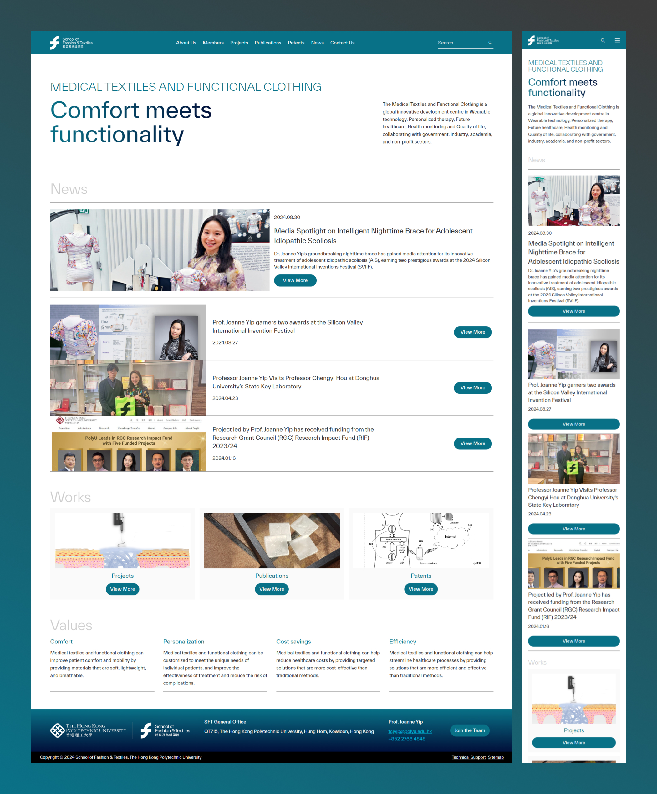 香港理工大學時裝及紡織學院嘅醫用紡織品和功能性服裝研究團隊,想有個平台展示佢哋豐富嘅研究成果,並方便公眾同佢哋聯繫。我哋為佢哋設計開發咗一個網站,清晰呈現團隊嘅相關資料,突顯團隊嘅專業形象。