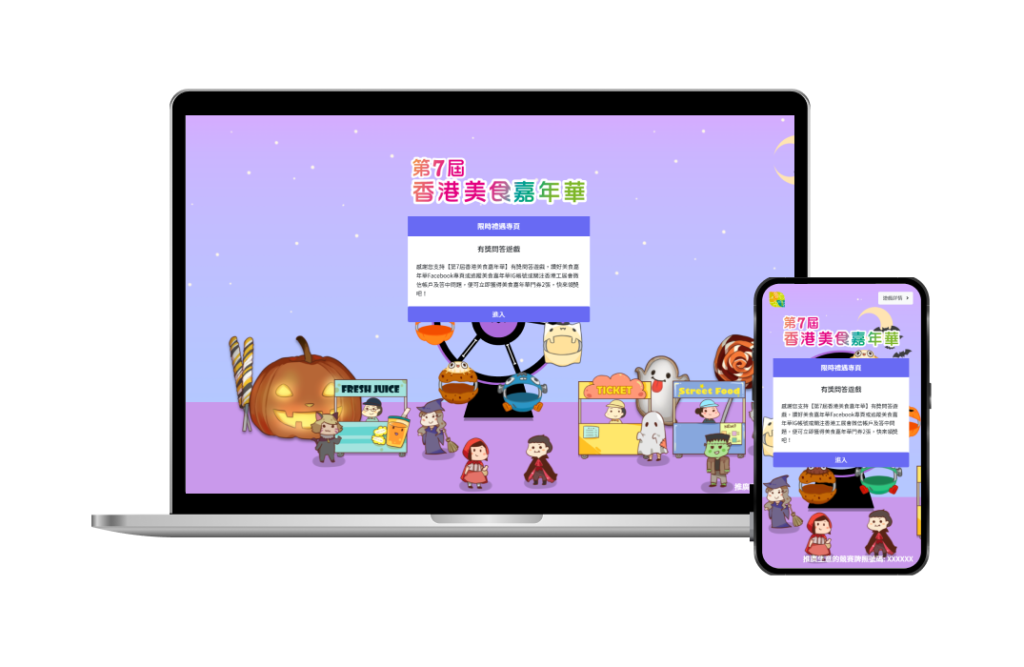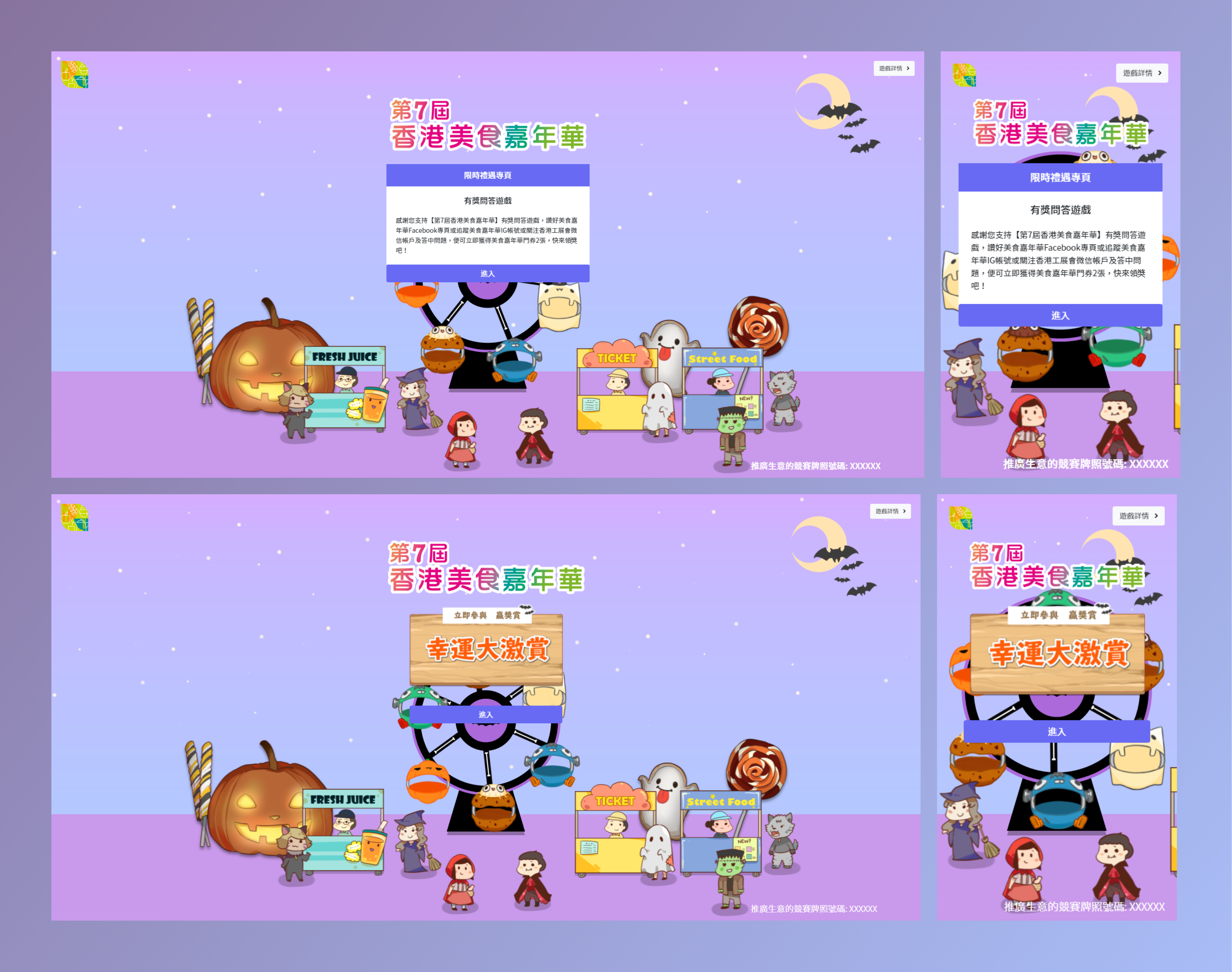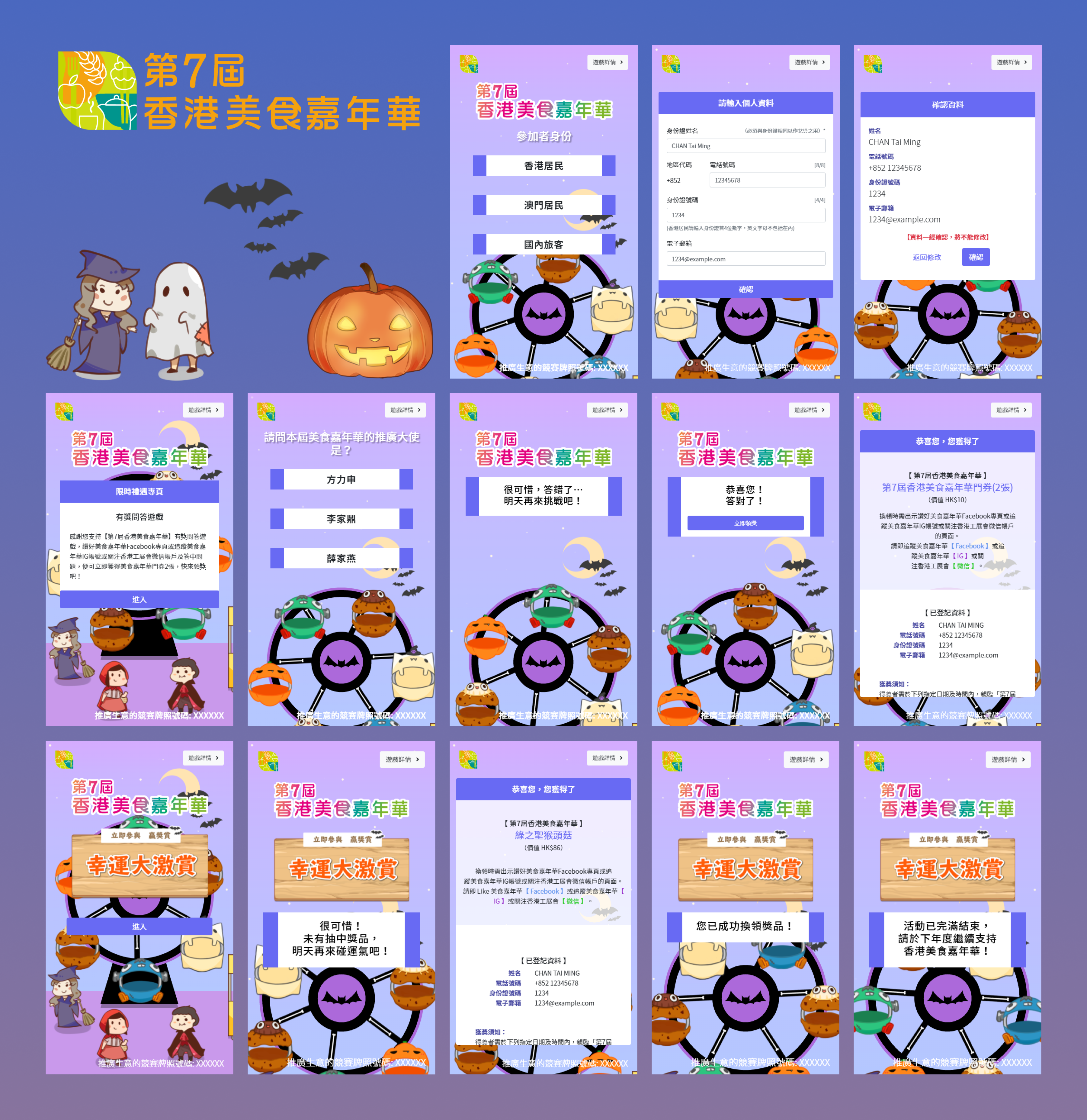 我哋連續幾年為香港美食嘉年華打造活動網站,活動網站主要功能分別為登記資料、互動遊戲及領獎。參與者只要完成登記,就可以參加互動遊戲。遊戲會根據階段而改變: