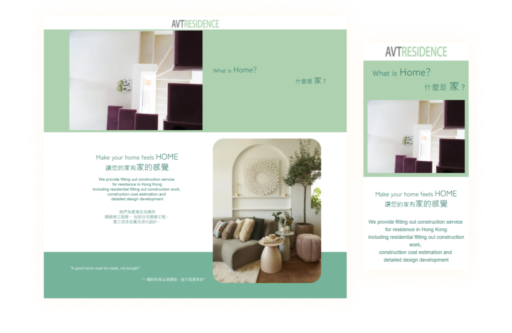 AVT Residence 選擇我哋為佢哋嘅官方網站進行翻新。我哋嘅團隊根據客戶提供嘅設計進行網站開發,並與 AVT Residence 保持緊密溝通,確保功能性及視覺效果都符合客戶所想。