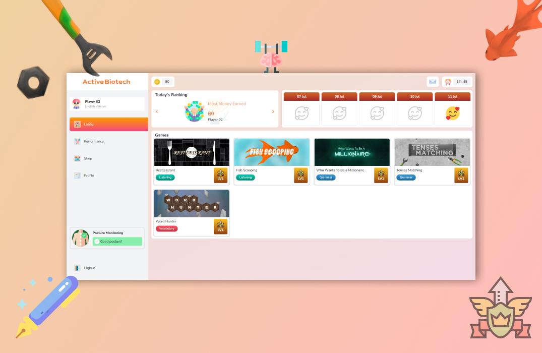 我哋為立剛健針對有脊椎問題嘅學生設計嘅產品製作咗配套遊戲平台網站,透過藍牙將傳感器連接到網站,就可以喺玩英文遊戲嘅同時監控坐姿。