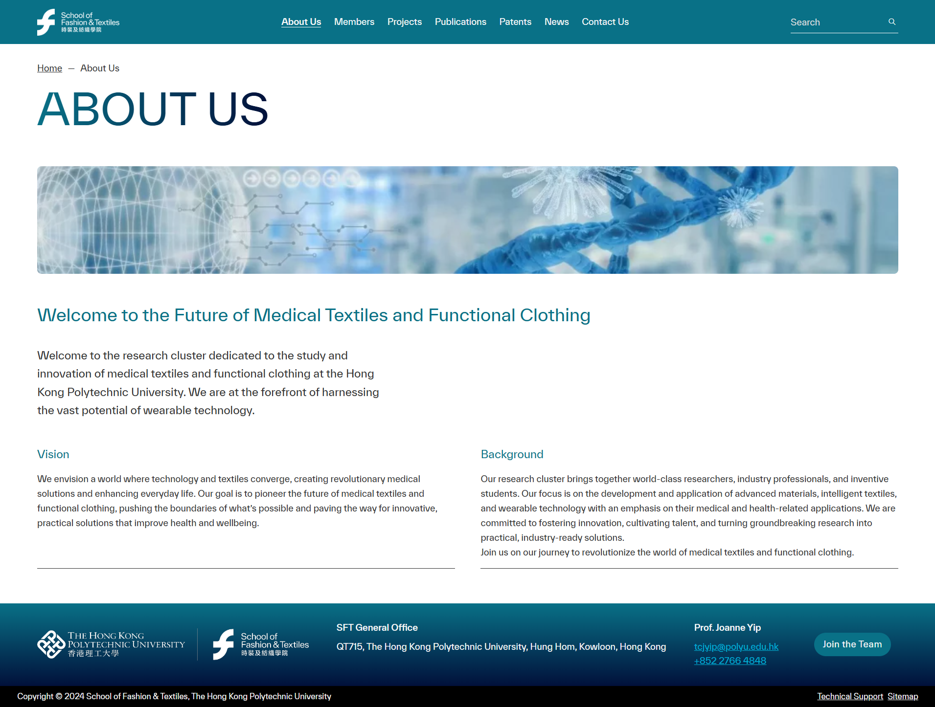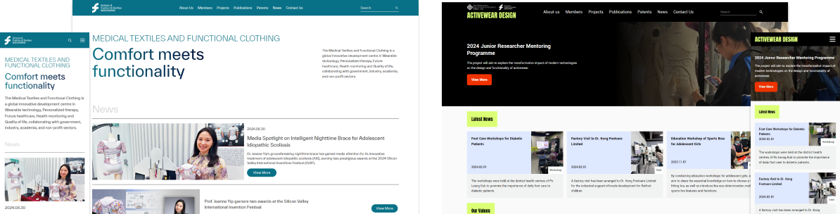 來自香港理工大學時裝及紡織學院嘅研究團隊 — 醫用紡織品和功能性服裝(Medical Textiles and Functional Clothing)和運動服裝設計及教育(Activewear Design and Education),專注於探索現代技術對服裝設計和功能性嘅變革性影響。雖然研究團隊成果纍纍,但未有統一展示嘅平台,希望我哋可以為佢哋開發網站解決呢個問題。