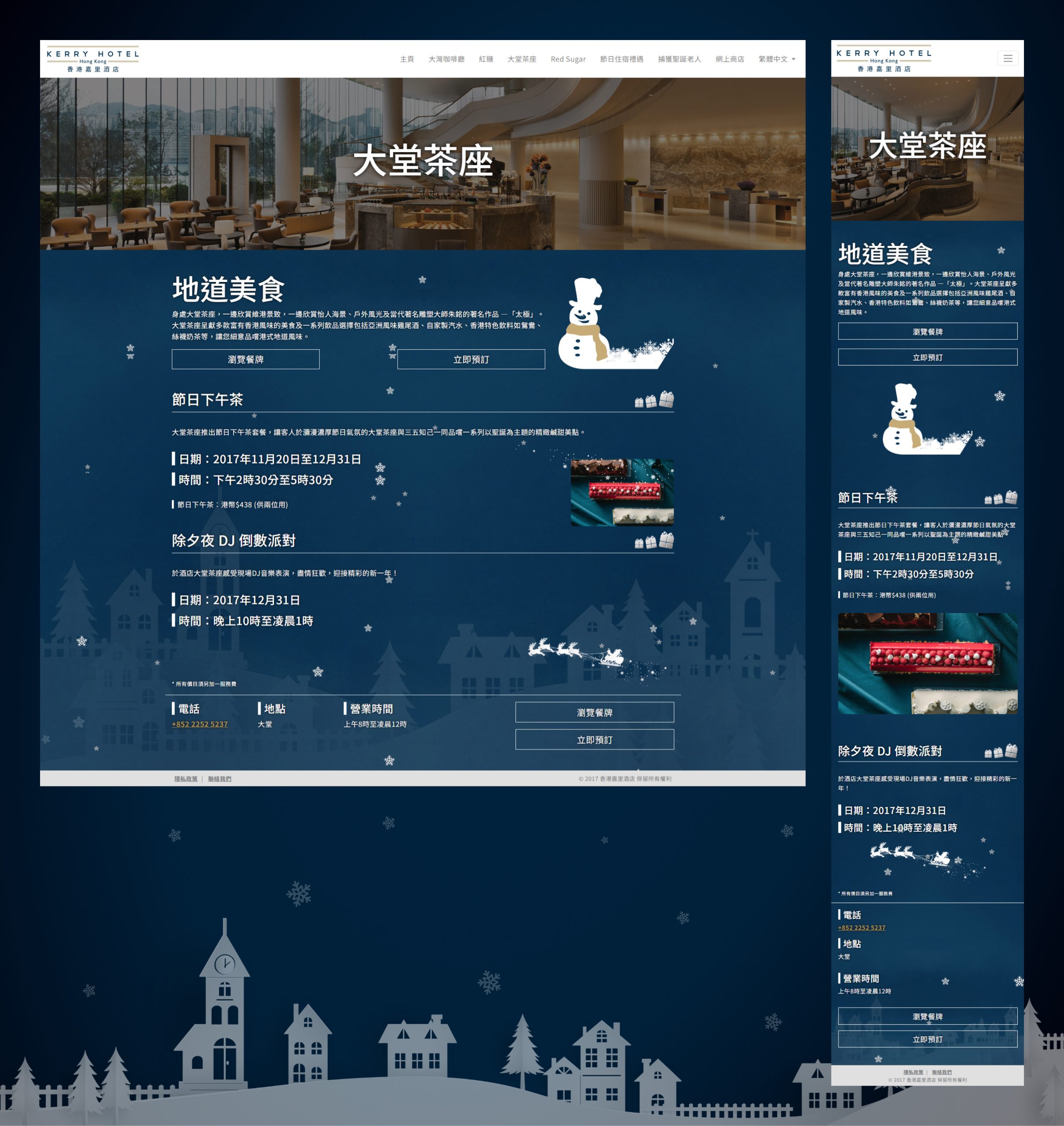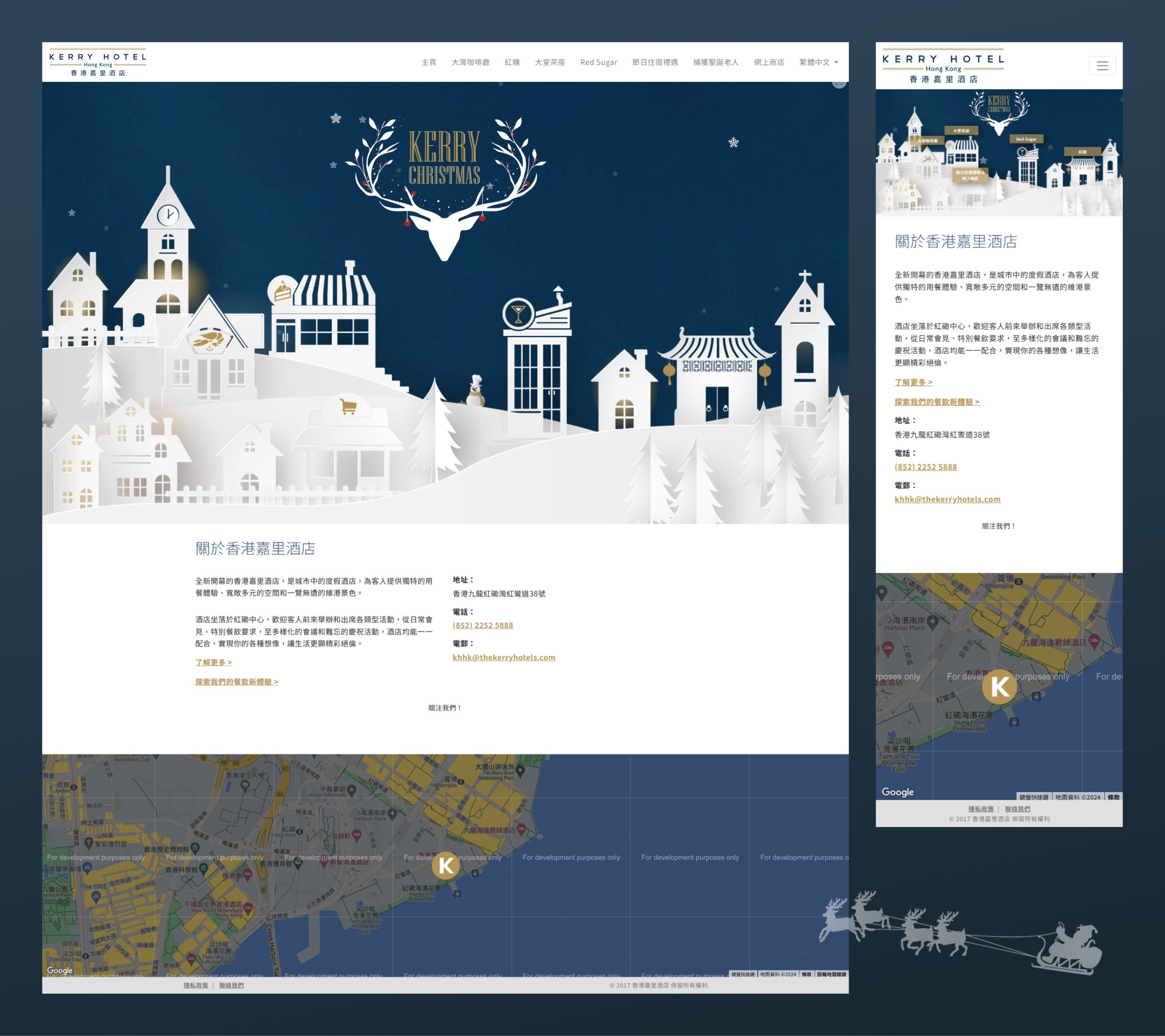 我哋為香港嘉里酒店(Kerry Hotel)設計咗一個充滿節日氣氛嘅聖誕活動網站,匯集咗所有喺聖誕期間舉行嘅活動資訊,包括聖誕餐飲套餐選擇和場地租借信息。